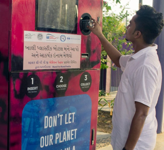 What happens to the millions of PET water bottles after you use them? At the Sabarmati Riverpark in Ahmedabad, Gujarat, we have created a solution. Our reverse vending machine helps recycle the plastic in a more effective manner! More than 2500 plastic bottles are dropped into this every month, the crushed plastic is then sent to recyclers. Visitors to the park are encouraged to drop their bottles here, in return for a discount coupon for the park facilities.